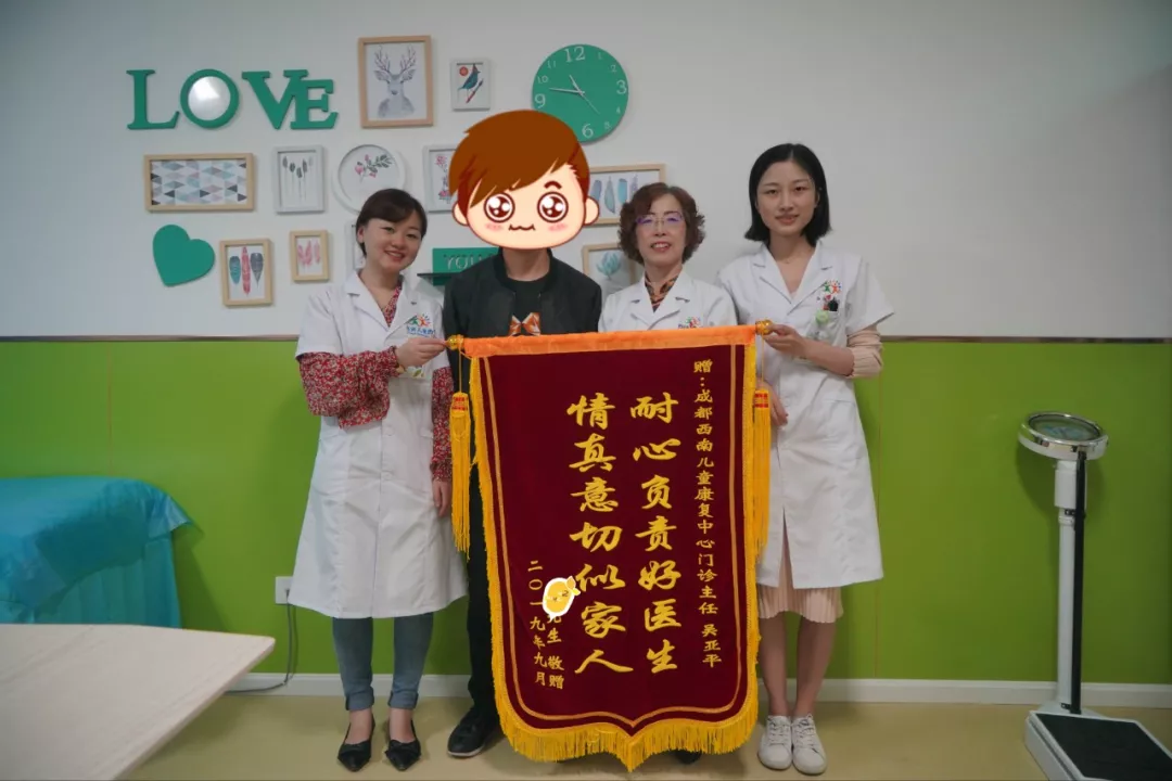 小江爸爸一时也不知该怎么感谢,出院前就偷偷去制作了这面锦旗,送给吴亚平医生和各位康复老师!