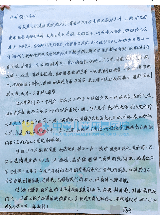 当我第三次走进医院的大门、拿着这几年来东奔西跑去广州、上海华西检查的厚厚的报告单时,我内心是绝望的,我的孩子,明明那么可爱,却始终不会讲话,不会看人,每当我叫他的名字,他却毫无反应,都已经快3岁了。我却没有等来一句“妈妈”。我和他的爸爸也因此吵过无数次架。所有的医生都告诉我,我的孩子是自闭症,是绝症,让我做好养他一辈子的准备。说他上不了学,可能他一辈子就这样了。但是,当徐主任您,当(把)他厚厚的报告单,一张张翻给我看,一张张讲给我听,给我的孩子制定了详细的康复方案,告诉我怎么样可以让我的孩子,重新回到幼儿园。我第一次看到了希望。
